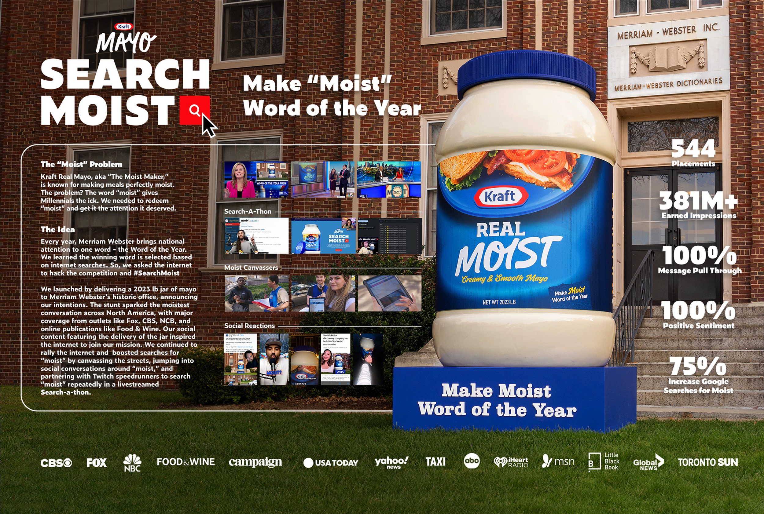 One of the best things you can say about Kraft Real Mayo is that it makes food “moist.” The only problem? “Moist” is one of the most hated words in the English language. So we set out to redeem the word, by hijacking a competition known for giving words prestige and a high profile: Merriam Webster’s Word of the Year.